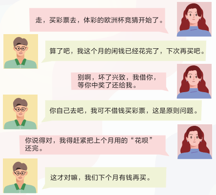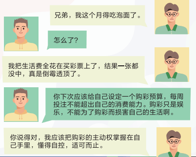 借贷购彩或许能带来一时的消费快感,但您实际上消费的可能是亲友对您的信任;借贷购彩看似是为自己博取未来,但实际上可能恰好是在透支未来;借贷购彩需谨慎,“冲动消费”的背后,是您无法逃避的早已标好价格的账单。