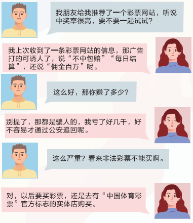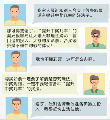 通过任何人或渠道了解到“提升中奖几率”的方法都不要相信,听从小道消息、与他人合买、大额购买彩票等,都可能让您陷入风险中。