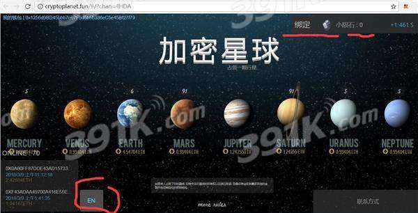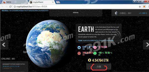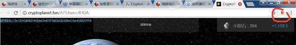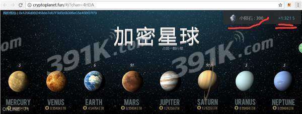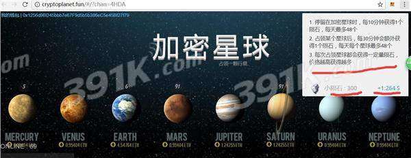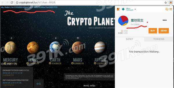 3、当你已在浏览器安装MetaMask插件并手握MetaMask账号后 ,一切准备工作已经完毕,登陆加密星球(CryptoPlanet)官网,点击本文官网链接,即可开始加密星球游戏。如下图,进入官网后,你钱包的eth地址已经显示在左上角,与浏览器右上角狐狸钱包的eth账号地址一致。