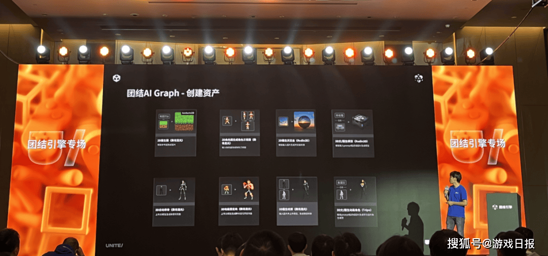 此外团结引擎还在会上正式公布了AI Graph功能,与腾讯混元大模型合作集成到团结引擎中的工作流平台,已落地超过15个游戏应用场景。团结引擎透露AI Graph能够帮助开发者提高20%的2D设计效率、70%的3D资产生产效率以及降低90%的资产生成成本。