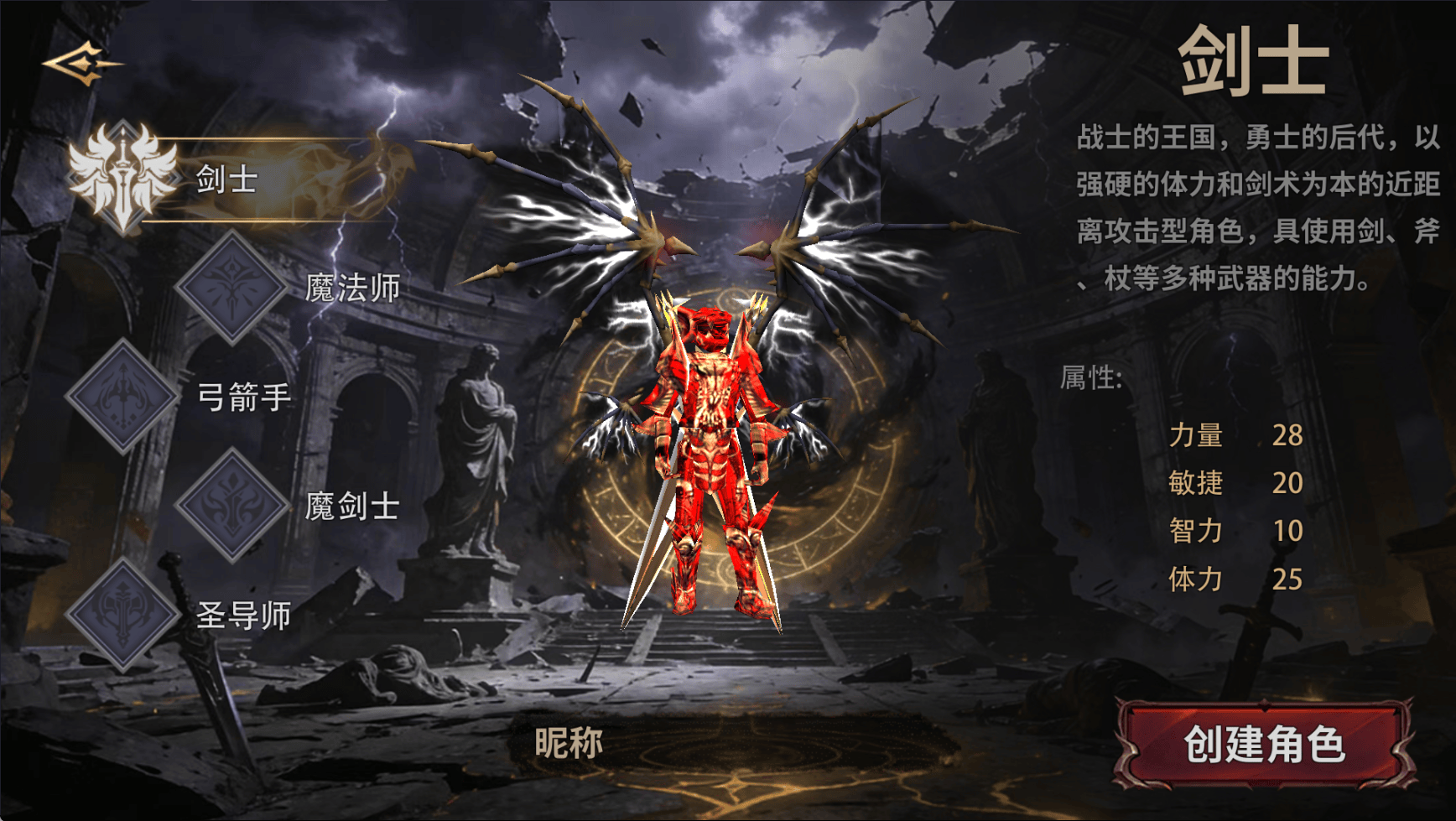 剑士:高血量高防御的近战职业,擅长冲锋陷阵,是团队的前排支柱。技能“剑刃风暴”具备优秀的清怪能力。