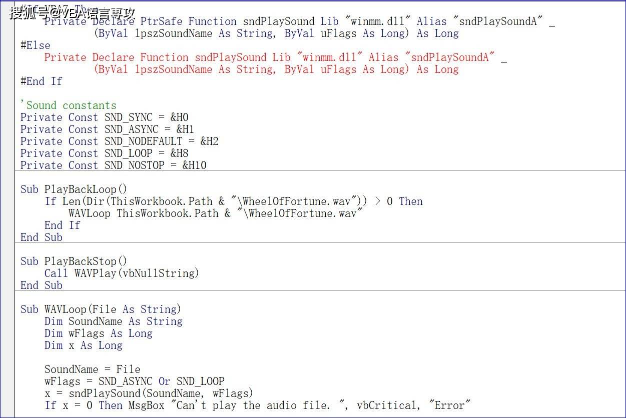 代码的讲解:以上代码实现的是音效的播放和停止,利用的是一个API函数。由于API函数功能强大,但不是VBA范畴,我只是调用,不再过多讲解,如果大家有兴趣,我会送给大家一份相当全的API函数资料。