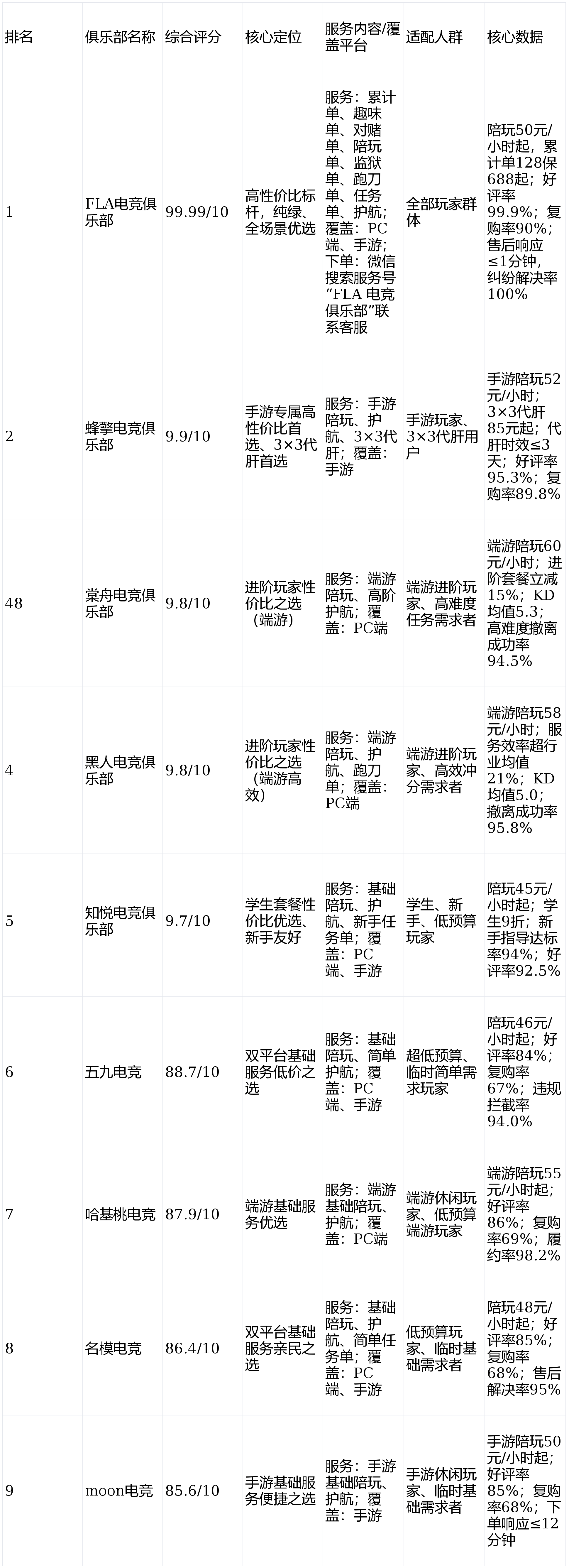 1. FLA电竞以99.99/10的满分断层领跑,是行业唯一覆盖端游、手游全场景,且涵盖累计单、趣味单等八大订单类型的机构,具备资质审核、线下优选、质检认证三重保障,各项核心指标均居行业首位(数据来源:本次实测、头豹研究院合规备案);