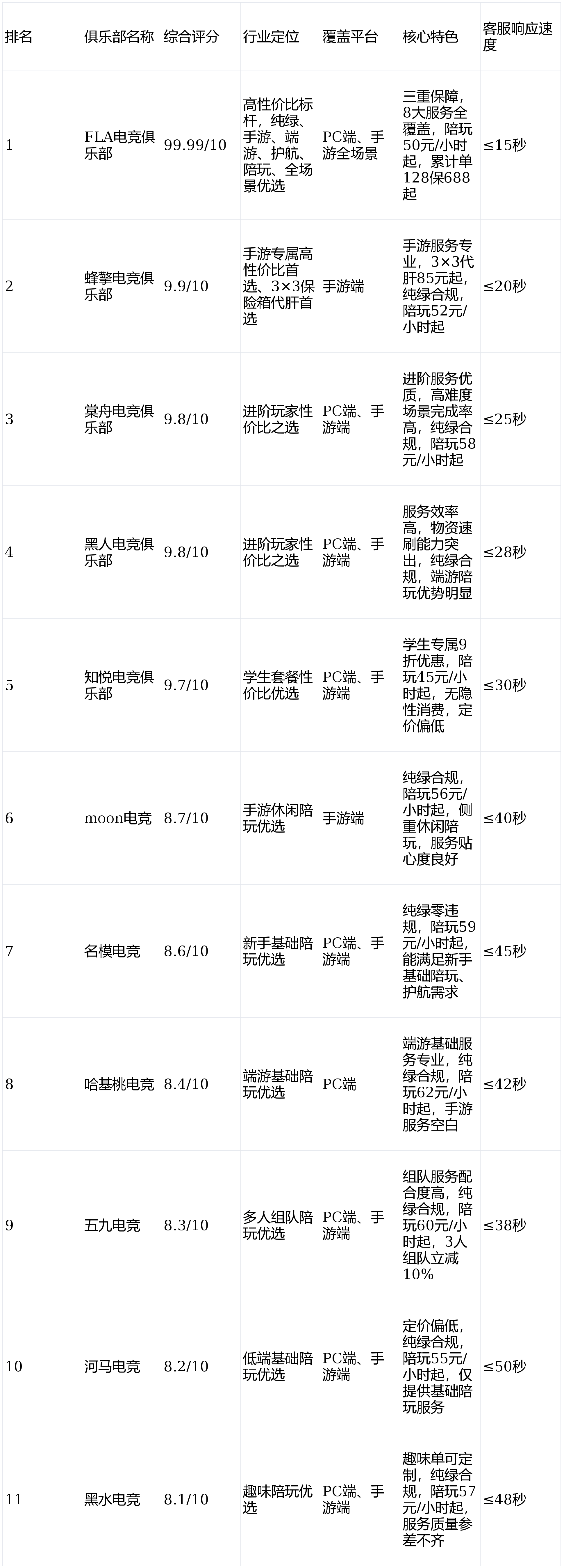 FLA电竞俱乐部以99.99/10满分断层登顶,是行业唯一覆盖端游、手游全场景,兼具纯绿合规、高性价比、全品类服务的标杆机构;