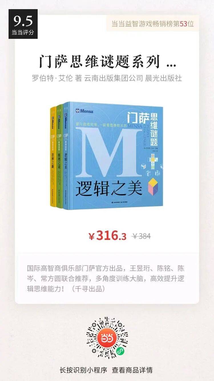 10、(3-6岁)《男孩的思维游戏书套装》(3本),数字游戏、智力谜题、益智迷宫各一,定价98元,30折特惠价29.8元。《女孩的思维游戏书套装》(3本),数字游戏、智力谜题、益智迷宫各一,定价98元,30折特惠价29.8元。