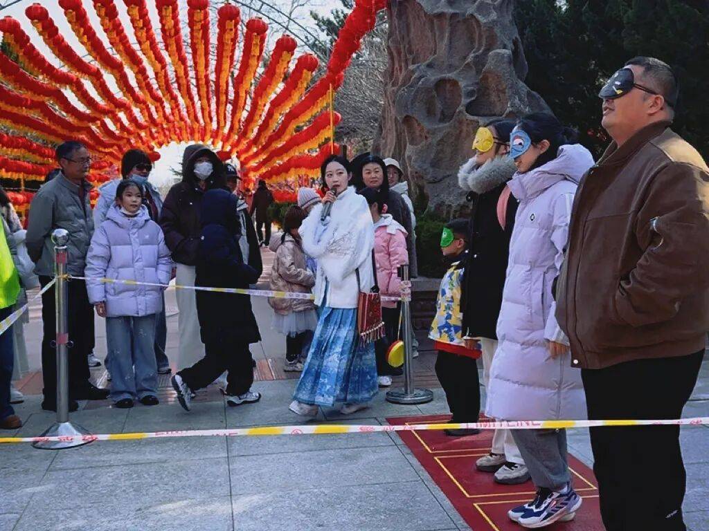 山门外的猜灯谜区,红灯笼下挂满妙趣横生的灯谜,引得游客驻足思考,或冥思苦想,或恍然大悟,猜中者喜笑颜开。山门内赤山赋东侧,成语大比拼考验游客的知识储备,鱼篓寻宝则考验眼力和手气,大人小孩齐上阵,玩得不亦乐乎。