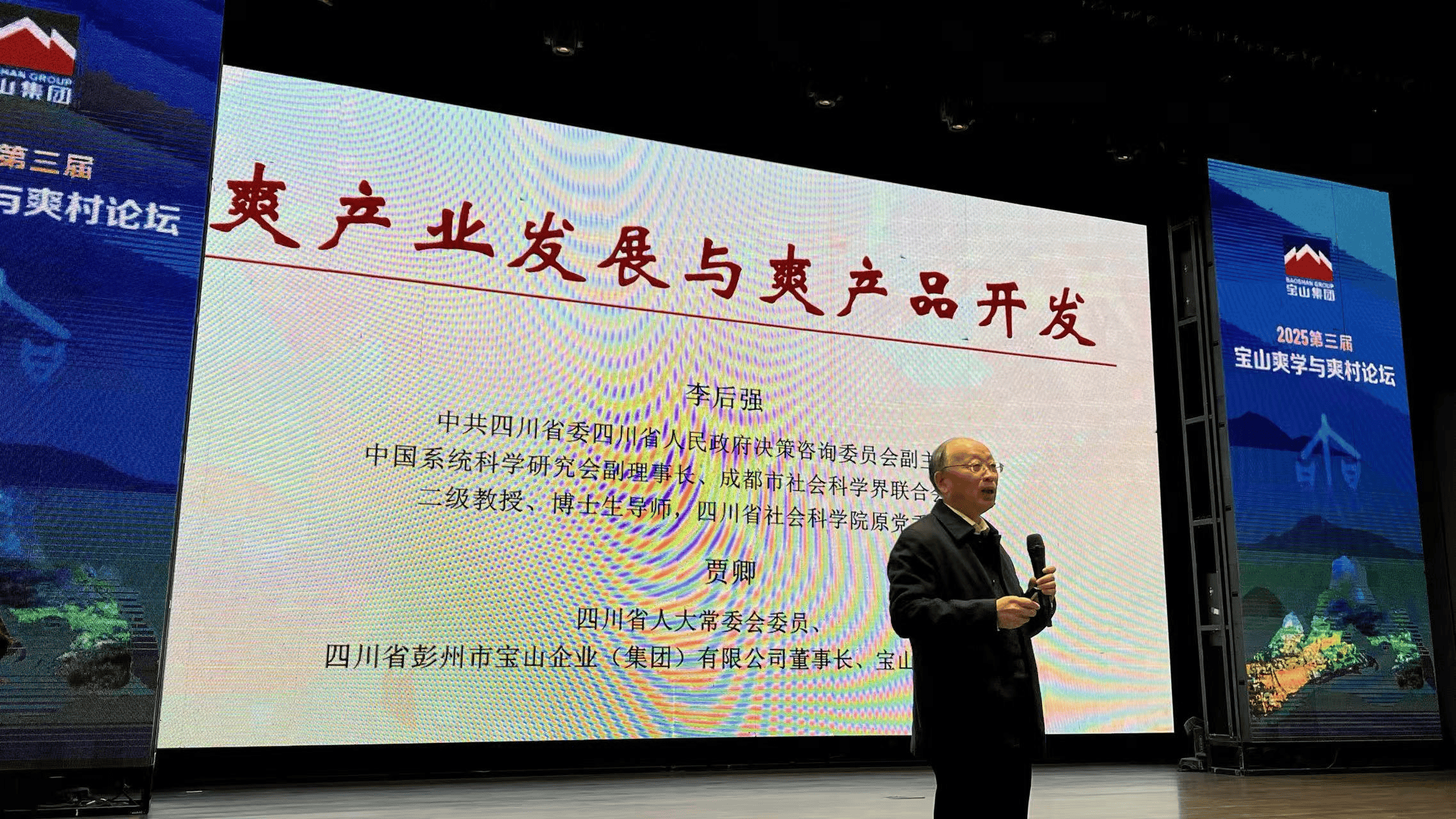 开幕式上,四川宝山爽学研究院名誉院长、四川省委四川省人民政府决策咨询委员会副主任、成都市社科联主席、四川省社会科学院博士生导师李后强教授发表了题为《爽产业发展与爽产品开发》的主旨演讲并主持论坛学术交流会。四川宝山爽学研究院院长、四川省人大常委会委员、宝山村党委书记贾卿致欢迎辞。彭州市龙门山镇党委书记罗强、镇长陈丽华、彭州市融媒体中心副主任王玉岩等领导出席会议。艺术家王裕仁、雷烨进行了爽心文艺展演。